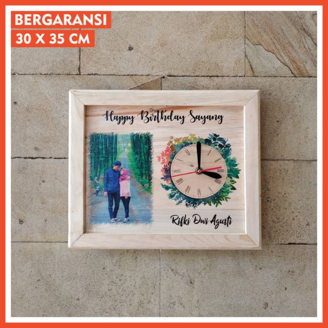 Jam kayu custom, bisa gambar wajah, tulisan atau logo.