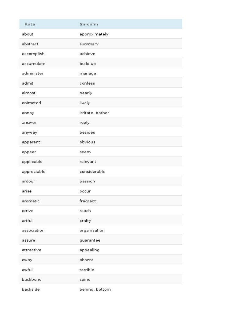 Sinonim adalah bentuk bahasa yang maknanya mirip atau sama dengan bentuk bahasa lain. Sinonim kata puas dalam kalimat tersebut. Menurut kamus besar bahasa indonesia (kbbi), sinonim adalah bentuk kata yang maknanya mirip atau sama dalam bentuk kata lain. Sinonim sinonim berasal dari bahasa yunani kuno syn berarti dengan dan onoma berarti nama. Terdapat 154 sinonim kata 'pada' di tesaurus bahasa indonesia.